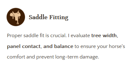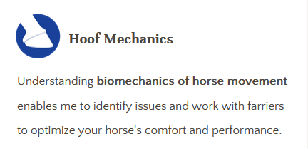 I've invested years studying equine anatomy, biomechanics, and hoof mechanics . My specialized training in saddle fitting ensures your horse's comfort and optimal movement.